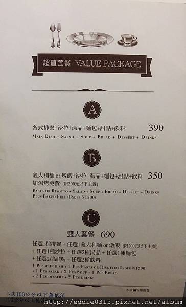 我跟媽媽兩個人細細算過後決定選擇套餐比較划算,於是選擇B套餐 350元《義大利麵/燉飯+沙拉+湯品+麵包+甜點+飲料》