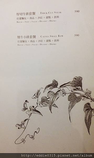 除了以上A、B、C、D、E、F套餐,還有"厚切牛排套餐"跟"犢牛小排套餐",兩個套餐都會附麵包、湯品、沙拉、甜點、飲料,這樣才590元耶!