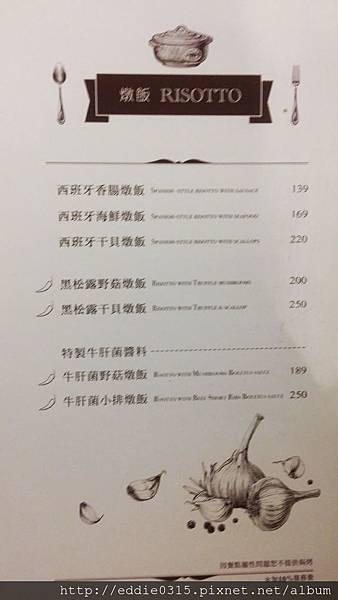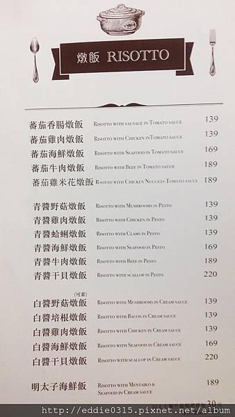 跟義大利麵一樣,左邊這樣的燉飯如果想要加焗烤只要+30元就可以囉!但右邊這頁的可能就要說聲抱歉了