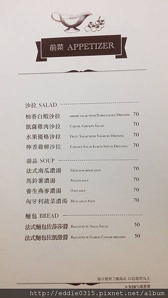 有沙拉、湯品、麵包,前面套餐中的附餐就是從中選擇口味,跟別間店比起來這裡的口味種類算是很多