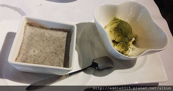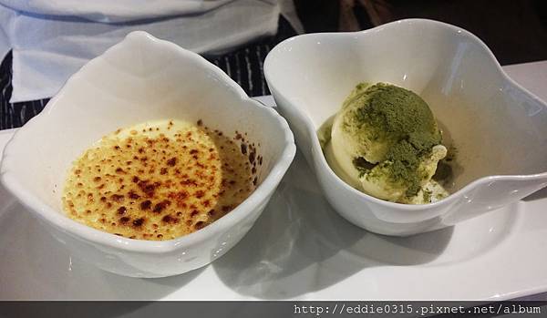 除了烤布蕾還附上一球香草冰淇淋撒上抹茶粉,苦甜苦甜很好吃